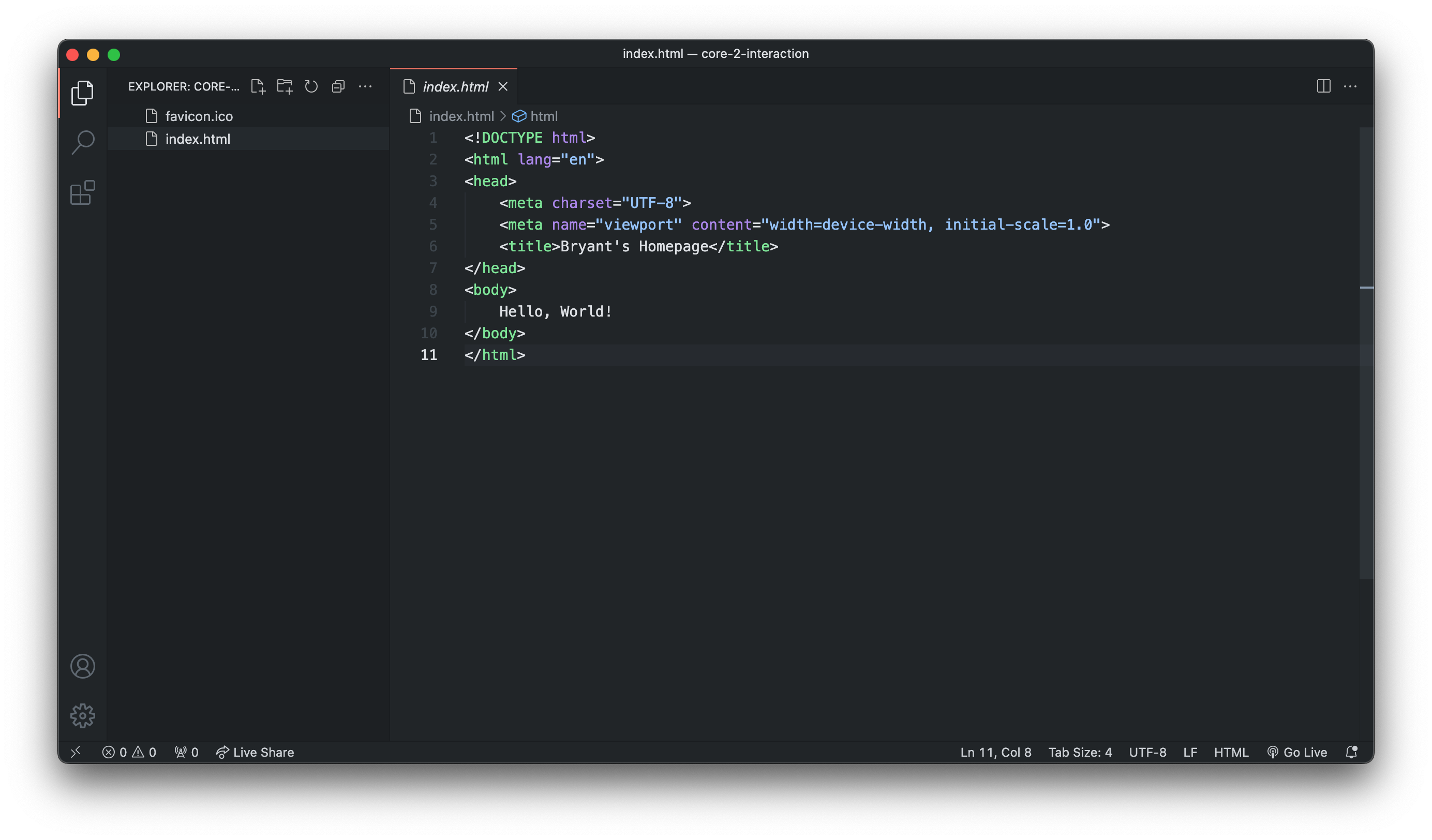 Now, test your local website by clicking the Go Live button on the bottom right of the VS Code window. This will create a temporary server on your computer – and should automatically open the window in your web browser: